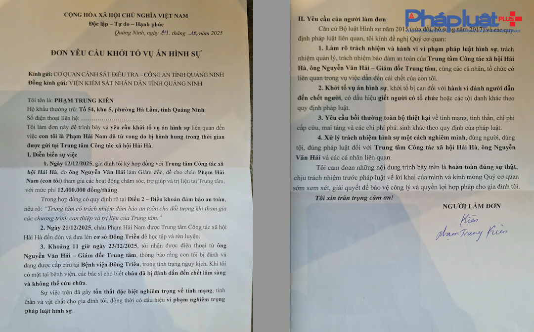 "Xử lý trách nhiệm hình sự một cách nghiêm minh, đúng người, đúng tội, đúng pháp luật đối với Trung tâm Công tác Xã hội Hải Hà do ông Nguyễn Văn Hải làm Giám đốc và các cá nhân liên quan", nội dung Đơn yêu cầu khởi tố vụ án hình sự nêu rõ.