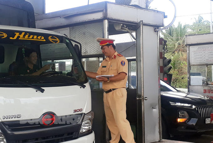 Cảnh sát giao thông phát tờ bướm tuyên truyềngiao thông tại khu vực trạm thu phí cầu Rạch Miễu. (Ảnh: Báo Đồng Khởi)