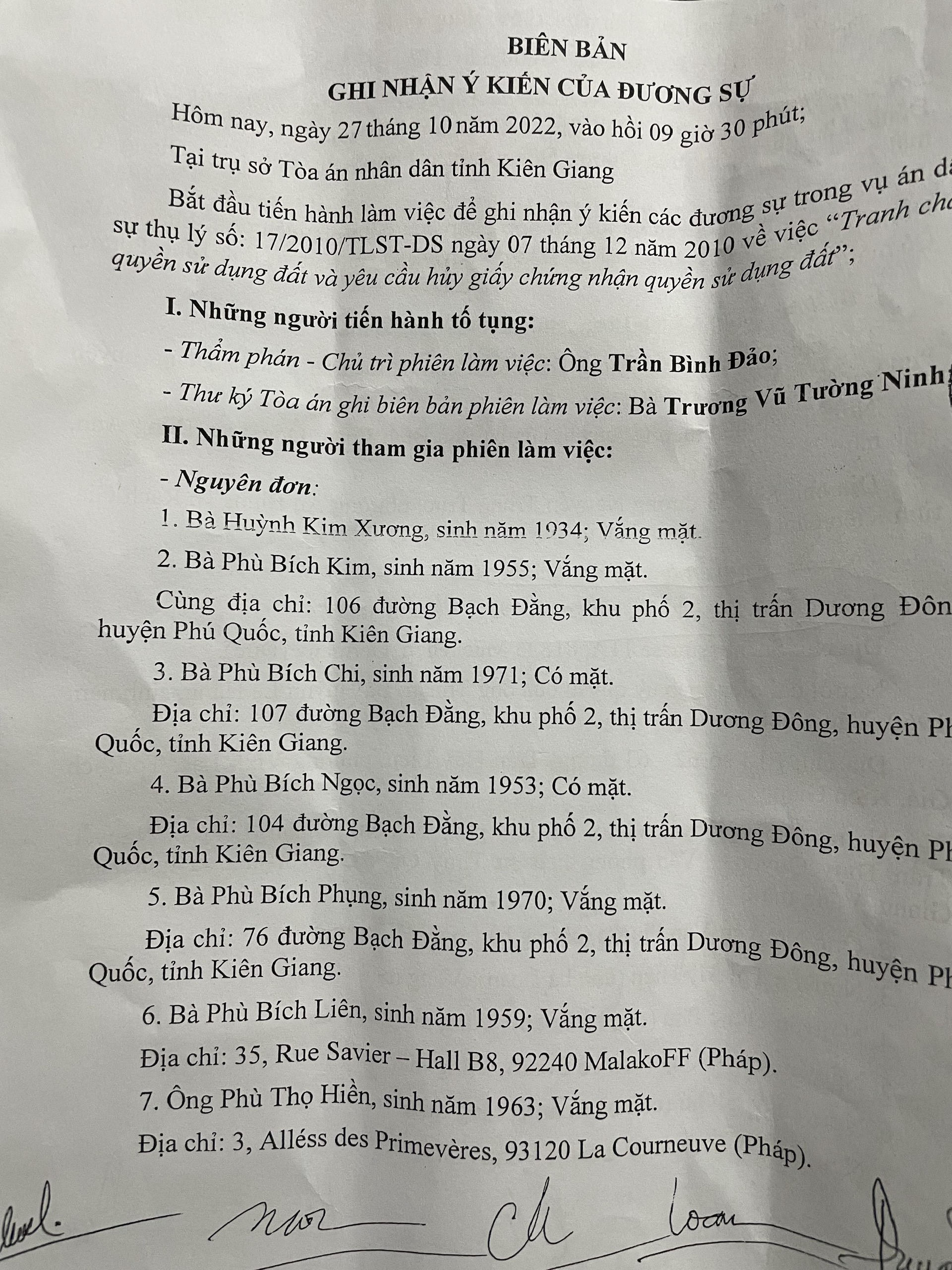 Theo nguồn tin cho biết, nội dung làm việc của ngày 27/10/2022 chỉ là một buổi ghi nhận ý kiến của đương sự của nguyên đơn, rằng ông Phù Thọ Thuận đã chết vào ngày 16/11/2020 tại Cộng hòa liên bang Đức. Vợ ông Thuận là người gốc Đức, gốc Đức không hề biết gì về vụ kiện tranh chấp tài sản thừa kế này.