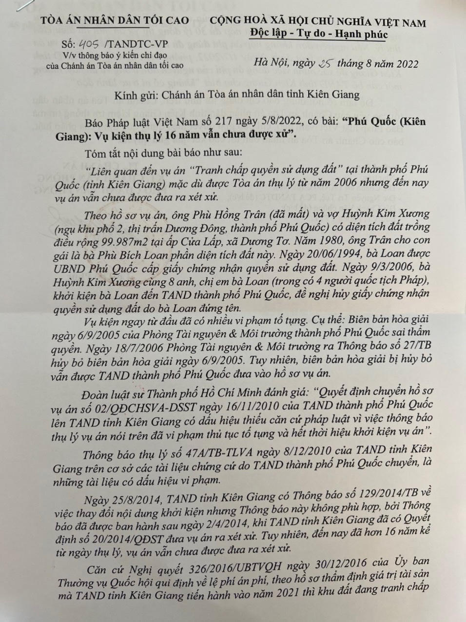 Ngày 25/8/2022, Tòa án nhân dân tối cao (TATC) ban hành công văn 405/TANDTC-VP về việc thông báo ý kiến chỉ đạo của Chánh án TATC gửi Chánh án Tòa án tỉnh Kiên Giang (TAKG) liên quan đến thông tin Báo Pháp Luật Việt Nam (PLVN), số 217, ra ngày 5/8/2022, phản ánh một vụ kiện thụ lý 16 năm vẫn chưa được xử ở Phú Quốc (tỉnh Kiên Giang).
