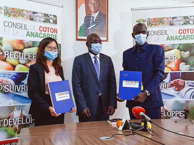 Bà Phạm Thị Phương Mai, đại diện Tập đoàn T&T Group và đại diện Liên minh các nhà xuất khẩu điều Bờ Biển Ngà ký kết hợp đồng thu mua 150.000 tấn điều thô dưới sự chứng kiến của Hội đồng Bông và Điều Bờ Biển Ngà