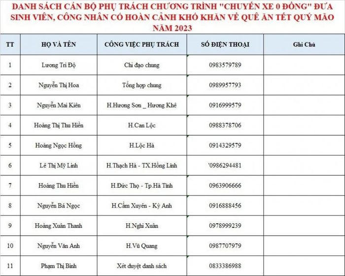 Danh sách và thông tin liên lạc với những người phụ trách chương trình "Chuyến xe 0 đồng".