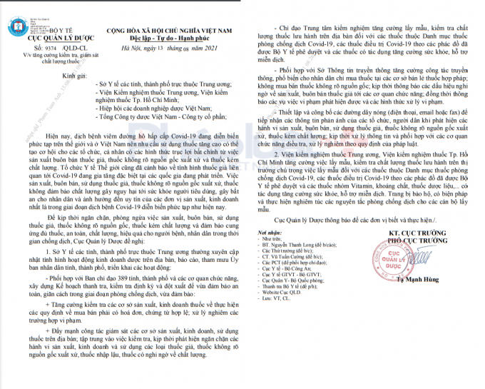 Ngày 13/8 Cục Quản lý Dược – Bộ Y tế đã gửi Công văn về việc tăng cường kiểm tra, giám sát chất lượng thuốc tới Sở Y tế các tỉnh, thành phố thường xuyên cập nhật tình hình hoạt động kinh doanh dược trên địa bàn phối hợp với Ban chỉ đạo 389 tỉnh, thành phố và các cơ quan chức năng, xây dựng kế hoạch thanh tra, kiểm tra các cơ sở sản xuất, kinh doanh thuốc để đảm bảo an toàn, giãn cách trong giai đoạn phòng chống dịch. Đồng thời, phát hiện ngăn chặn các hành vi sản xuất, kinh doanh và sử dụng các loại thuốc giả, thuốc không rõ nguồn gốc xuất xứ, thuốc nhập lậu, thuốc có nghi ngờ về chất lượng.