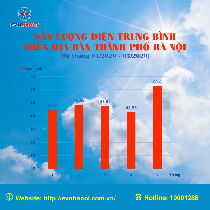 Theo thống kê của Tổng công ty Điện lực Thành phố Hà Nội (EVNHANOI), mới đầu hè nhưng sản lượng điện tiêu thụ bình quân tăng cao hơn nhiều so với các tháng trước liền kề. Cụ thể, tháng 4/2020, sản lượng điện bình quân đạt 42,99 triệu kWh. Nhưng đến tháng 5/2020, Hà Nội chỉ hứng chịu 1 đợt nắng nóng duy nhất trong vòng 2 ngày (vào ngày 20 và 21/5/2020) đã nâng lượng điện tiêu thụ bình quân cả tháng lên mức 62,6 triệu kWh, tăng 45% so với tháng 4.