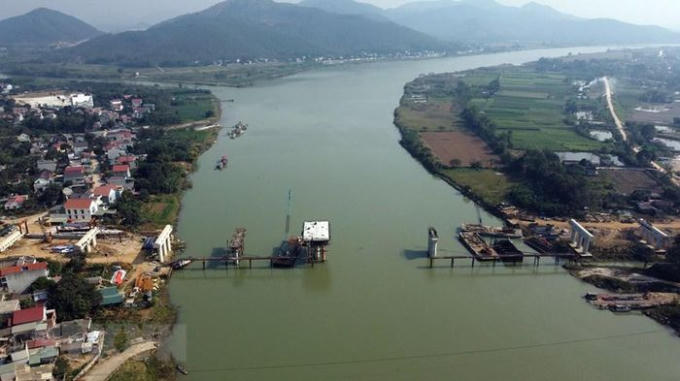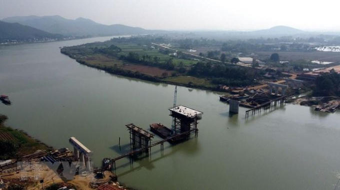 Thi công tại cầu Vĩnh An có chiều dài 475,90m vượt sông Mã (nối hai huyện Vĩnh Lộc và Yên Định). (Ảnh: Huy Hùng/TTXVN)
