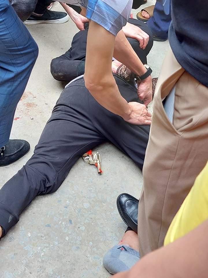 Trong lúc dùng dao và súng khống chế chủ tiệm vàng tại ngã ba Môi, phường Quảng Tâm (TP Thanh Hóa), đối tượng là nam giới đã bị chủ tiệm vàng quật ngã.