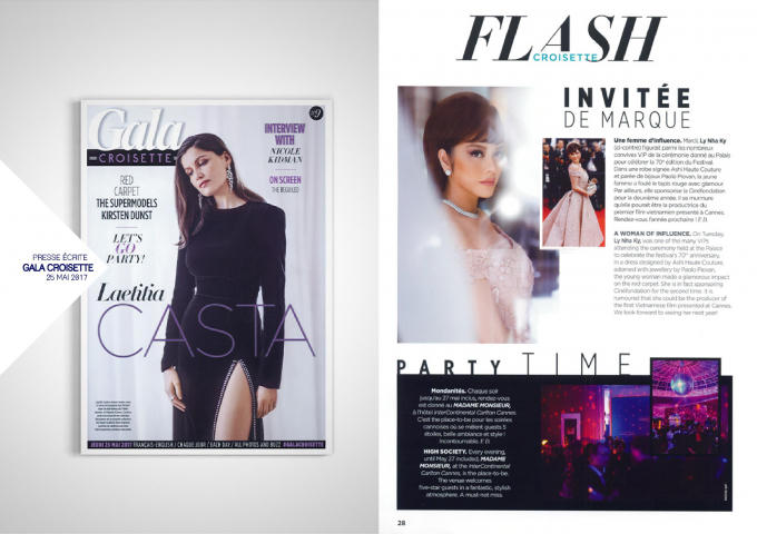 Chuyên mục Flash Croisette - Tạp chí Gala viết: "Vào thứ 3, Lý Nhã Kỳ, là 1 trong những khách mời VIP tham dự buổi lễ được tổ chức tại Cung điện chào mừng 70 năm kỷ niệm Liên hoan phim Cannes.