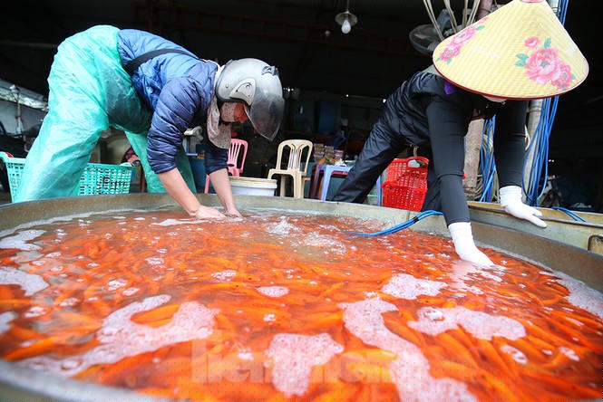 Trưa 2/2 (tức 21 tháng Chạp), mặc dù còn 2 ngày nữa mới chính thức đến ngày tiễn ông Công ông Táo nhưng chợ cá Yên Sở đã tấp nập người dân cùng thương buôn mang cá chép đỏ từ khắp các tỉnh thành đổ về.