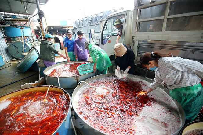 Hàng chục xe tải từ nhiều tỉnh thành như: Phú Thọ, Nam Định, Vĩnh Phúc…chở cá chép về chợ cá, sau đó được phân phối đến các chợ lớn, nhỏ tại Hà Nội để phục vụ nhu cầu người dân trong dịp cúng ông Công, ông Táo.