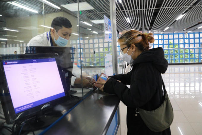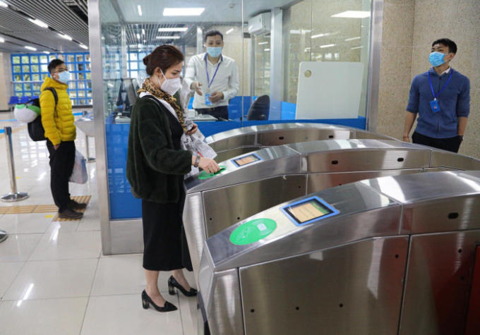 Nhân viên nhà ga hướng dẫn khách quẹt vé tháng khi đi tàu