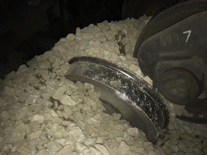 Tại hiện trường, toa hàng số 3 chở đá bị đổ nghiêng. Cột đèn tín hiệu phí trước bị tông gãy. May mắn không có thương vong về người.
