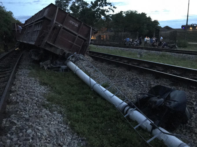 Sau khi trật bánh khỏi đường ray, toa tàu đứt ra lật nghiêng tông gãy một cột đèn tín hiệu...rất may không có thiệt hại về người.