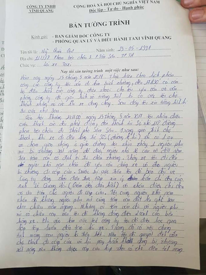 Do tấm ván dài quá chiều ngang thân xe, nên hai cánh cửa xe taxi không thể đóng lại, đành phải mở bung hai cánh, người nhà nạn nhân thò tay ra giữ, rồi chiếc taxi lao nhanh đến bệnh viện Đa khoa tỉnh Thanh Hóa.