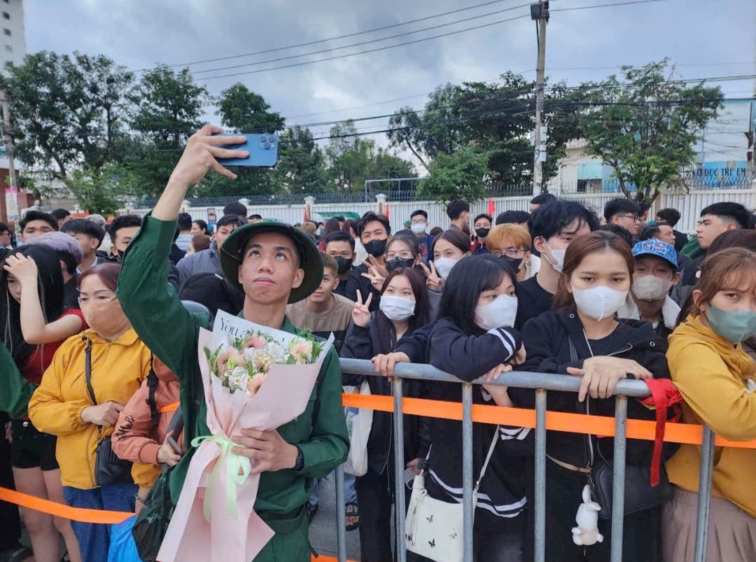 | Nhiều người thân, bạn bè tiễn các tân binh lên đường nhập ngũ làm nhiệm vụ thiêng liêng. Ảnh: T.H |