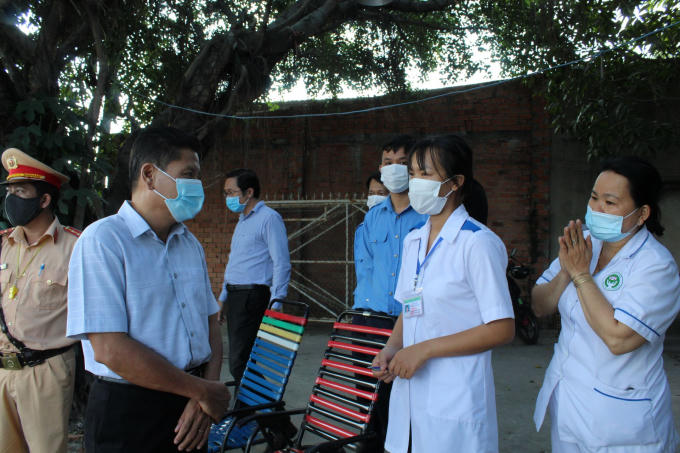 Ông Nguyễn Tấn Tài – Giám đốc Sở GTVT thăm hỏi, động viên các em sinh viên tình nguyện trường Trung cấp Y tế tại chốt kiểm soát ngã tư Hữu Nghị (huyện Bến Cầu).