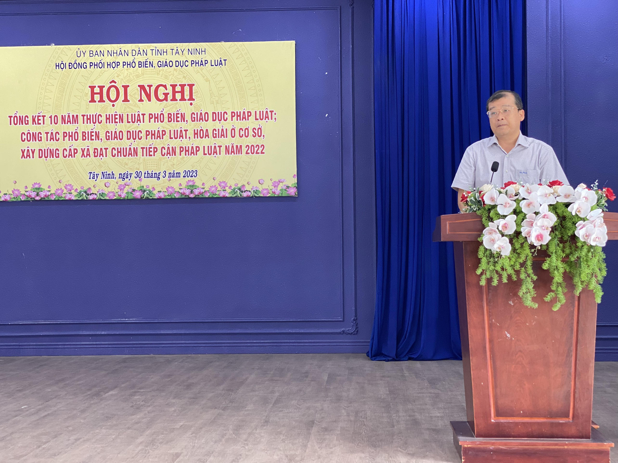 Phát biểu chỉ đạo tại hội nghị, ông Võ Đức Trong - Phó Chủ tịch UBND tỉnh, Chủ tịch Hội đồng phối hợp phổ biến, giáo dục pháp luật tỉnh đánh giá rất cao những kết quả địa phương đã đạt được trong 10 năm thực hiện Luật Phổ biến, giáo dục pháp luật năm 2012 và công tác phổ biến, giáo dục pháp luật, hòa giải ở cơ sở, xây dựng cấp xã đạt chuẩn tiếp cận pháp luật năm 2022.
