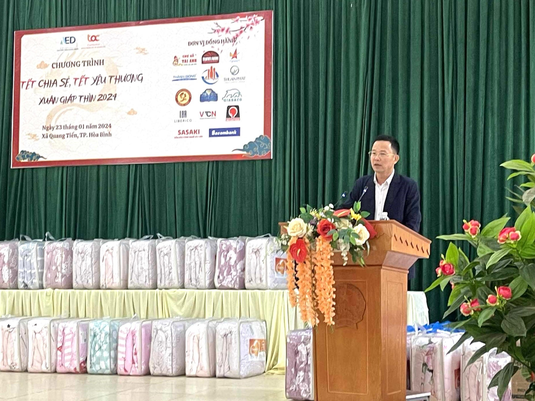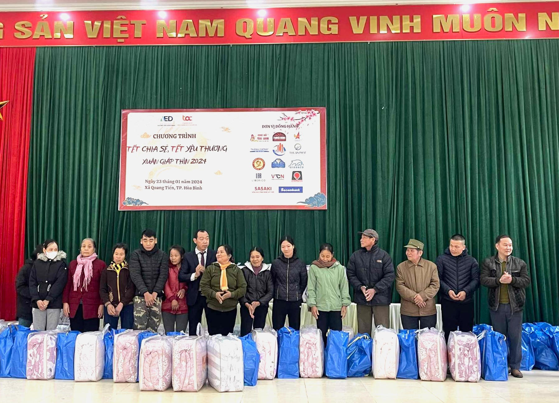 Đoàn công tác của Trung tâm Hỗ trợ doanh nghiệp vừa và nhỏ phía Bắc cùng các mạnh thường quân trao tặng quà Tết tại xã Quang Tiến, TP Hòa Bình