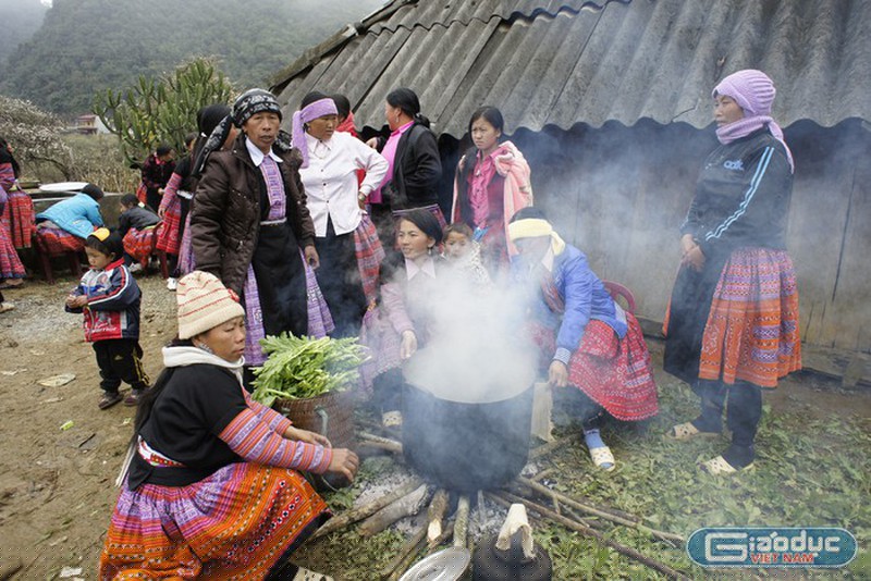 Các gia đình người Mông quây quần nấu cỗ ngay trong vườn nhà (Ảnh: Báo Giáo dục Việt Nam).