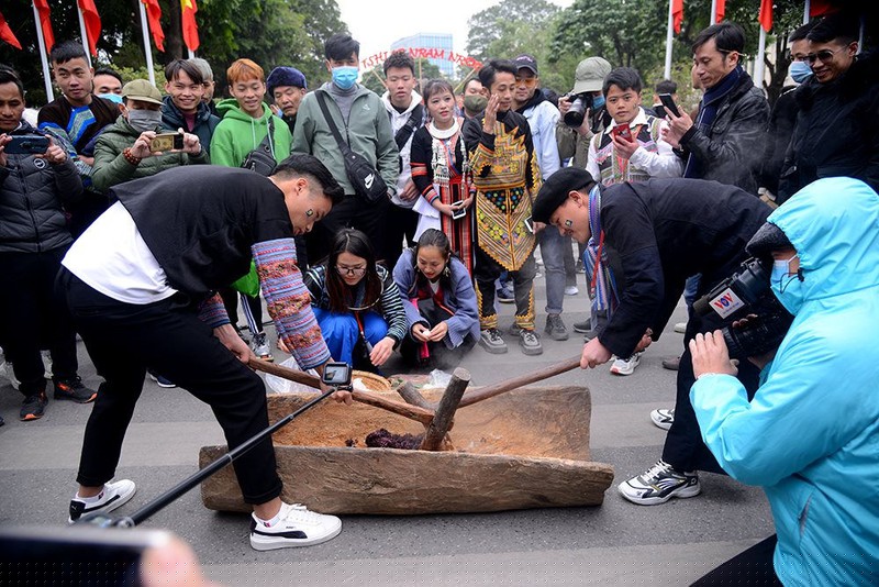 Du khách còn được thể nghiệm truyền thống giã bánh dày - một loại bánh không thể thiếu trong ngày Tết của dân tộc Mông.
