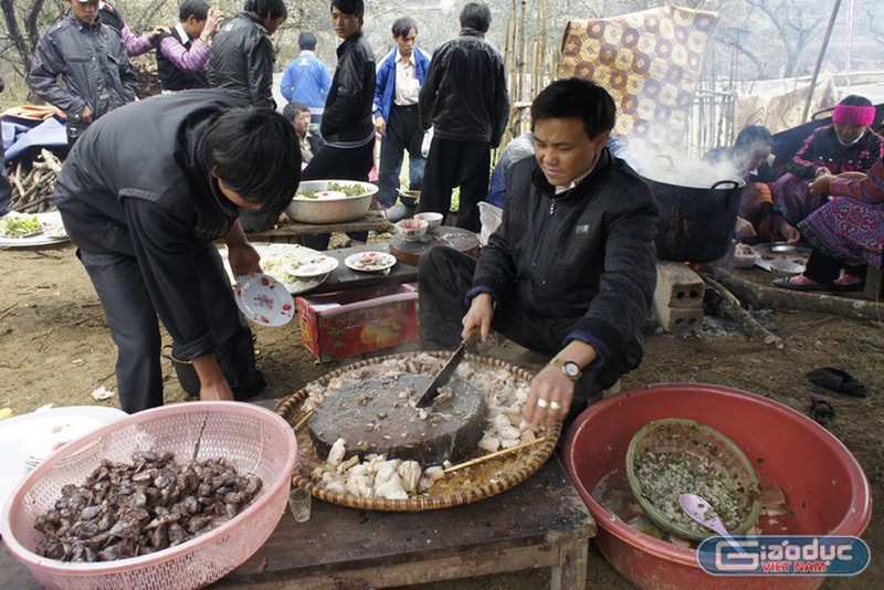 Nhiều gia đình trong bản cùng chung nhau làm thịt một con lợn to để ăn Tết (Ảnh: Báo Giáo dục Việt Nam).