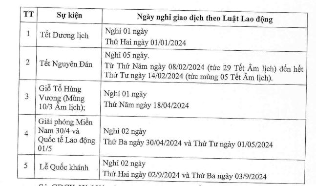 Cùng thông báo trên, Sở Giao dịch chứng khoán Hà Nội thông báo lịch nghỉ giao dịch năm 2024.