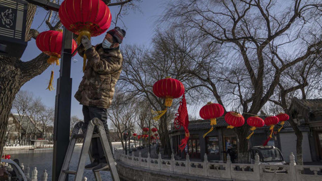 Một công nhân treo đèn lồng đỏ truyền thống cho Lễ hội mùa xuân sắp tới tại một khu thương mại và du lịch, ngày 3/2/2021 ở Bắc Kinh, Trung Quốc. Ảnh: Kevin Frayer / Getty Images AsiaPac / Getty Images.
