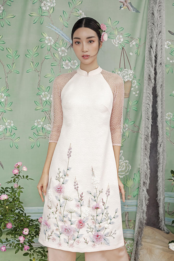 Chọn những thiết kế cách tân, Đỗ Mỹ Linh vừa khoe được vẻ đẹp truyền thống, vừa mang nét hiện đại. Chất liệu gấm quen thuộc trong những thiết kế áo dài xưa được tạo điểm nhấn khi phối cùng chi tiết ren ấn tượng ở phần cánh tay giúp hình ảnh của Hoa hậu Việt Nam trở nên mới mẻ, khác với những bộ ảnh áo dài trước đây. Các hoạ tiết như cành hoa, cánh chim én... được thêu thủ công và đầy tỉ mỉ, giúp mang đến không khí rộn ràng của một mùa Xuân mới sắp về.