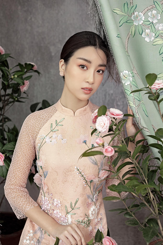 Chọn những thiết kế cách tân, Đỗ Mỹ Linh vừa khoe được vẻ đẹp truyền thống, vừa mang nét hiện đại. Chất liệu gấm quen thuộc trong những thiết kế áo dài xưa được tạo điểm nhấn khi phối cùng chi tiết ren ấn tượng ở phần cánh tay giúp hình ảnh của Hoa hậu Việt Nam trở nên mới mẻ, khác với những bộ ảnh áo dài trước đây. Các hoạ tiết như cành hoa, cánh chim én... được thêu thủ công và đầy tỉ mỉ, giúp mang đến không khí rộn ràng của một mùa Xuân mới sắp về.