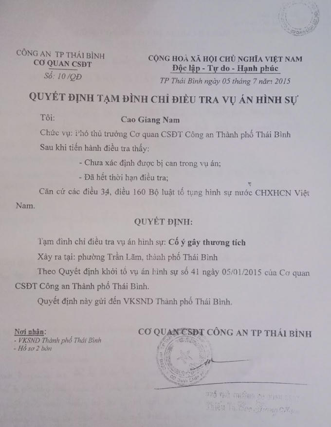 Bất ngờ hơn nữa, 6 tháng sau đó, đến ngày 5/7/2015, Cơ quan CSĐT Công an TP Thái Bình lại ra Quyết định số 10 tạm đình chỉ điều tra vụ án hình sự nói trên. Văn bản do Thiếu tá Cao Giang Nam, Phó thủ trưởng Cơ quan CSĐT ký. Lý do của quyết định này là: Chưa xác định được bị can trong vụ án và đã hết thời hạn điều tra.
