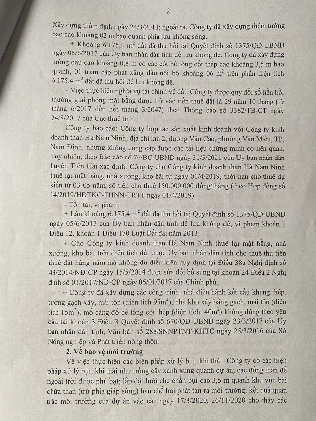 Báo cáo số 76/BC-UBND ngày 31/5/2021 của UBND huyện Tiền Hải cũng nêu: Công ty Trang Thiên Tân cho Công ty kinh doanh than Hà Nam Ninh (địa chỉ: Km2, đường Văn Cao, phường Văn Miếu, TP Nam Định) thuê lại mặt bằng, nhà xưởng, kho bãi từ ngày 1/4/2019. Số tiền cho thuê theo Hợp đồng số 14/2019/HĐTKC-THNN-TRTT ngày 1/4/2019 là 150 triệu đồng/tháng.