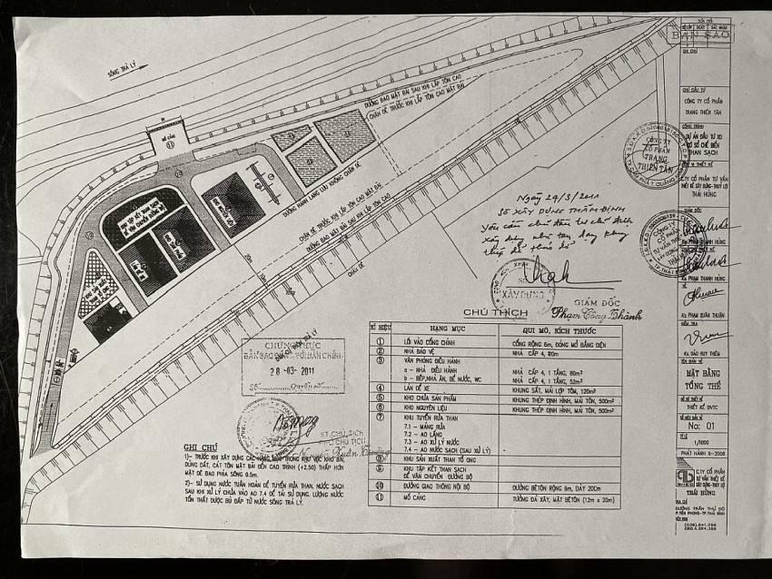 Theo sơ đồ thửa đất, vị trí xây dựng Dự án cơ sở sản xuất than sạch của Công ty Trang Thiên Tân có một phía giáp với sông Trà Lý, một phía giáp với đường hành lang lưu không đê.