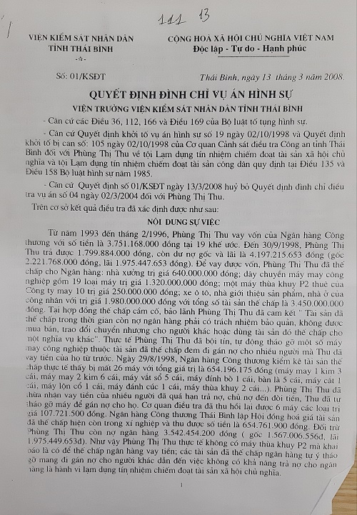 Mặc dù được trả tự do, nhưng đến 02/3/2004 Viện KSND tỉnh Thái Bình ra Quyết định đình chỉ điều tra bị can số 09/KSĐT đối với bà Phùng Thị Thu do Phó Viện trưởng – Hoàng Văn Vĩnh ký và Quyết định đình chỉ vụ án hình sự số 01/KSĐT ngày 13/3/2008 do Viện trưởng VKSND tỉnh Thái Bình ký, khi đó bà Phùng Thị Thu mới thực sự được trả lại sự trong sạch.