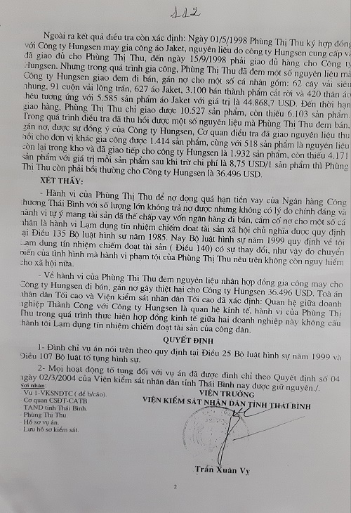 Đề nghị các cơ quan chức năng tỉnh Thái Bình cần sớm vào cuộc làm rõ kỳ án này để tiến hành xác mình làm rõ trách nhiệm của tập thể và cá nhân gây nên vụ án cho bà Thu. Đồng thời có biện pháp sớm khắc phục những thiệt hại mà bà Phùng Thị Thu và Xí nghiệp may Thành Công phải hứng chịu.