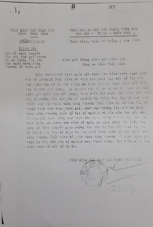 Cụ thể, ngày 10/6/1999 tức là trước khi TAND tỉnh Thái Bình đưa vụ việc ra xét xử, Viện KSND tỉnh Thái Bình đã ra văn bản số 521/KSĐT – KT và văn bản số 522/KSĐT - KT do ông Trần Xuân Vị - Phó viện trưởng ký cho phép Ngân hàng Công thương định giá tài sản và tiến hành phát mại.