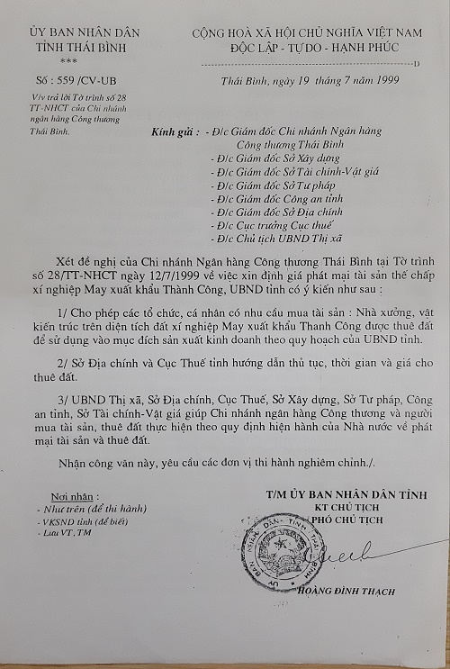 Bên cạnh đó, UBND tỉnh Thái Bình cũng đã ra công văn số 559/CV – UB do ông Hoàng Đình Thạch – Phó chủ tịch UBND tỉnh ký có ghi rõ: “Cho phép các tổ chức, cá nhân có nhu cầu mua tài sản: Nhà xưởng, vật kiến trúc trên diện tích đất Xí nghiệp may Thành Công được thuê đất để sử dụng vào mục đích sản xuất kinh doanh theo quy hoạch của UBND tỉnh”.