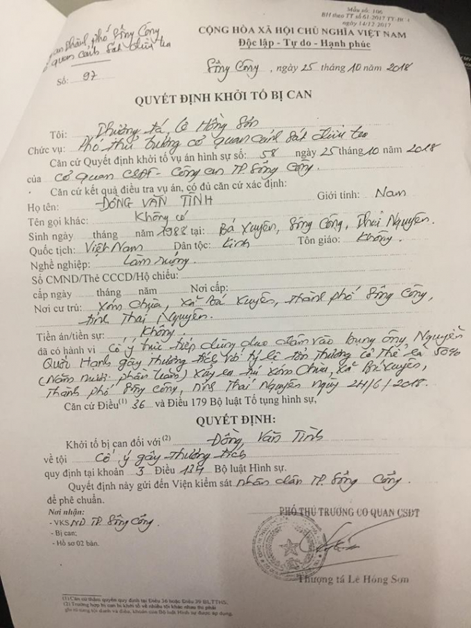 Sau khi sự việc xảy ra, anh Tình cùng gia đình đã có đơn gửi đến cơ quan công an đề nghị được giải quyết. Thế nhưng, quá trình giải quyết vụ án, cơ quan Công an TP Sông Công cũng xác định ông Hạnh bị thương tích 50%, Công an TP Sông Công xác định người gây thương tích cho ông Hạnh là anh Tình nên ngày 25/10/2018 đã ra quyết định khởi tố vụ án, khởi tố bị can đối với anh Tình về tội cố ý gây thương tích.