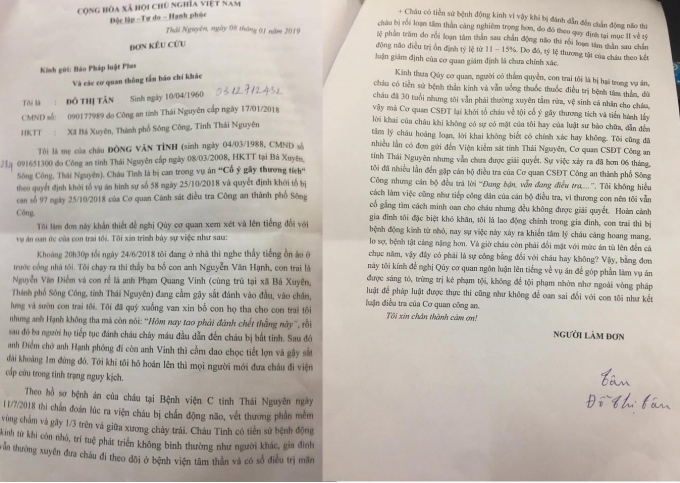 Nội dung đơn thư của bà Tân cho biết, khoảng 20h30 ngày 24/6/2018, do mâu thuẫn từ việc hát hò tại quán karaoke của ông Nguyễn Quốc Hạnh, giữa anh Tình và ông Hạnh, con trai ông Hạnh là Nguyễn Văn Điểm, con rể ông Hạnh là Phạm Quang Vinh (cùng trú tại xã Bá Xuyên, TP Sông Công, tỉnh Thái Nguyên) đã xảy ra ẩu đả.