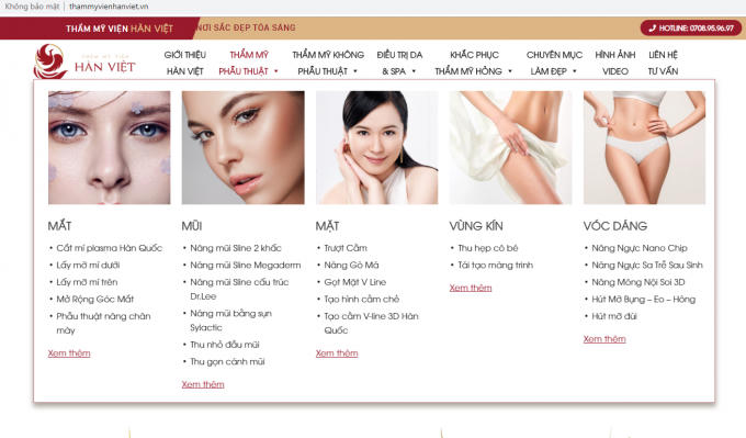 Cụ thể, dù chưa được phê duyệt danh mục kỹ thuật và xác nhận nội dung quảng cáo nhưng trên trang web http://thammyvienhanviet.vn/ được giới thiệu là trang web của TMV Hàn - Việt vẫn quảng cáo rầm rộ nhiều dịch vụ thẩm mỹ như: cắt mắt, nâng mũi, gọt cằm V-line,… Không những vậy, trang fanpage còn dùng những lời có cánh chiêu dụ khách hàng như “Nơi sắc đẹp tỏa sang” hay “Mang sắc đẹp Việt tỏa sáng rực rỡ”.