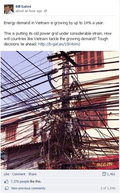 ![]() Năm 2013, trên Facebook của Bill Gates đăng tải bức ảnh chụp cảnh “ma trận” dây điện ở Việt Nam kèm status, tạm dịch: Tại Việt Nam, nhu cầu năng lượng đang tăng 14% một năm. Lưới điện cũ này bị quá tải. Những đất nước như Việt Nam làm sao để giải quyết nhu cầu điện ngày càng tăng? Những quyết định khó khăn đang nằm ở phía trước. Bức ảnh này đã nhận được sự chú ý của cộng đồng mạng trên thế giới và Việt Nam. Hàng ngàn người đã vào like, bình luận và chia sẻ bức ảnh. |