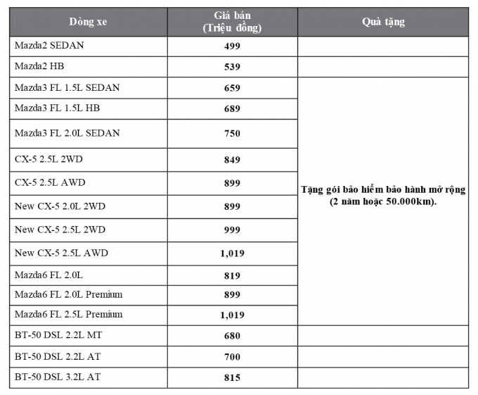 Tuy không tiến hành giảm giá bán, nhưng khách hàng khi mua 3 dòng xe: Mazda3, CX-5, Mazda6 đều được tặng gói bảo hiểm bảo hành mở rộng (2 năm hoặc 50.000 km).
