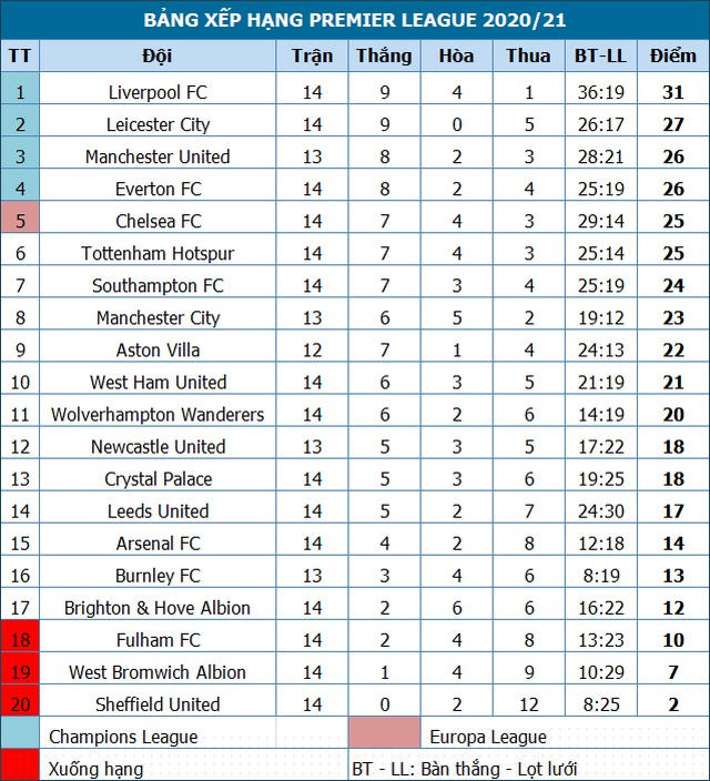 Có thêm ba điểm, Chelsea nâng điểm số lên 25 sau vòng đấu thứ 14. Đoàn quân của Lampard giành vị trí thứ năm từ tay Tottenham, hai đội bằng điểm nhưng Chelsea có chỉ số phụ tốt hơn đội bóng cùng thành phố, West Ham vẫn chỉ có 21 điểm và xếp ở vị trí thứ 10.