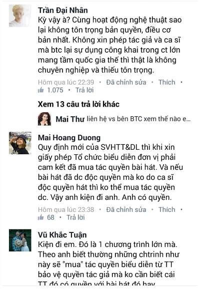 Bài hát được sử dụng Duy cũng vui thôi, nhưng thiết nghĩ ban tổ chức nên tôn trọng tác giả và ca sỹ độc quyền. Bên Duy chưa nhận được bất kì lời xin phép nào về việc sử dụng bài hát. Duy cũng không muốn làm lớn chuyện này làm gì, nhưng lời chào cao hơn mâm cỗ. Chỉ một cú điện thoại thôi mà, có khó khăn gì đâu".