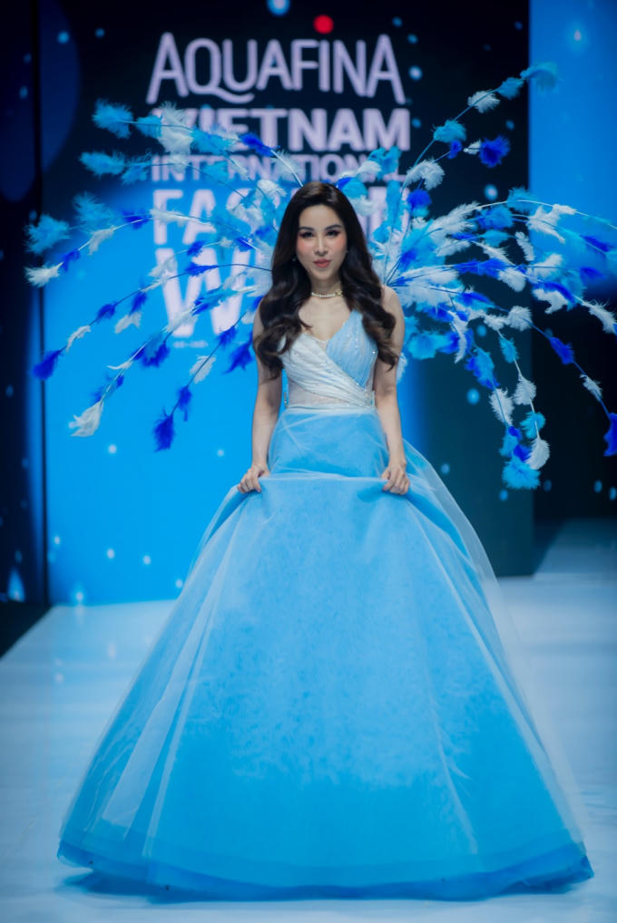 Hoa hậu Hoàng Dung hóa thành một “nàng công chúa” khoe trọn vòng eo “con kiến” của mình cùng điểm nhấn là các cánh lông vũ với sắc trắng - xanh được gắn phía sau.
