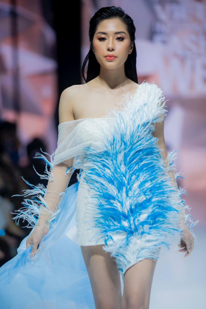 Hoa hậu Tô Diệp Hà diện thiết kế váy body được đính kết lông vũ tỉ mỉ cùng tà váy buông thả tự nhiên tạo cảm giác bồng bềnh, nữ tính nhưng không kém phần quyến rũ, mê hoặc.