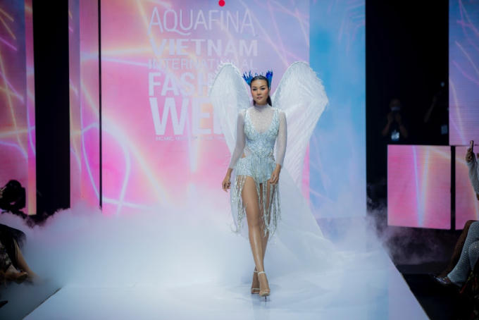 Diện thiết kế giống như một nữ hoàng uy quyền, với đôi cánh thiên thần tinh khôi được gắn lông vũ nhẹ nhàng bay bổng, siêu mẫu để lại ấn tượng mạnh với phong cách trình diễn đẳng cấp, tôn lên sản phẩm của nhà mốt Ivan Trần.