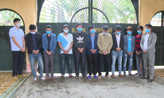 11 đối tượng bị bắt quả tang gồm: Lê Văn Úy (SN 1969, ở phường Khương Thượng, quận Đống Đa, Thành phố Hà Nội); Hoàng Hồng Cường (SN 1981); Trịnh Hùng Cường (SN 1972); Lê Huy Thiện (SN 1989); Lê Văn Cường (SN 1986); Trịnh Xuân Chữ (SN 1984); Lê Tài Khiêm (SN 1981, đều ở xã Hoằng Lưu, huyện Hoằng Hóa); Nguyễn Văn Quyết (SN 1983); Hoàng Văn Hào (SN 1998); Đỗ Văn Dương (SN 1991) đều ở xã Hoằng Thắng, huyện Hoằng Hóa và Lương Khả Thanh (SN 1976, ở xã Hoằng Phong, huyện Hoằng Hóa).