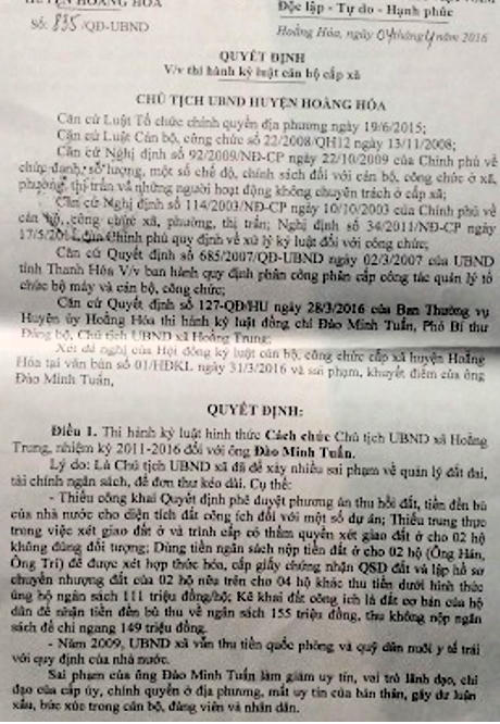 Trước những sai phạm do người dân phản ánh, tố cáo; căn cứ kết luận Thanh tra huyện, kết luận của các đoàn công tác, ngày 4/4/2016, ông Lê Đức Giang - Chủ tịch UBND huyện Hoằng Hóa đã ban hành Quyết định số 835/QĐ/UBND về việc cách chức đối với ông Đào Minh Tuấn - Chủ tịch UBND xã Hoằng Trung.