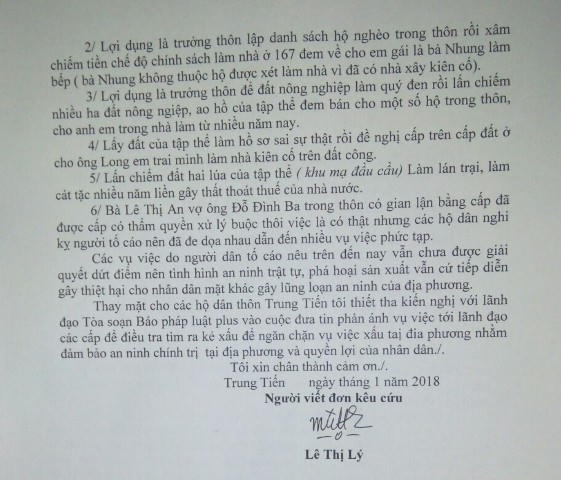 Theo bà Lý, trước đó bà làm đơn tố cáo những sai phạm của nguyên trưởng thôn Trung Tiến Lê Thế Đức. Ông Đức nhiều năm làm trưởng thôn đã gây ra những sai phạm như chia chác bán đất công, khai thác cát lậu và lập bãi tập kết cát trái phép, lợi dụng chức trưởng thôn đưa em gái vào danh sách hộ nghèo để hưởng lợi xây nhà theo diện 167 cho người nghèo...