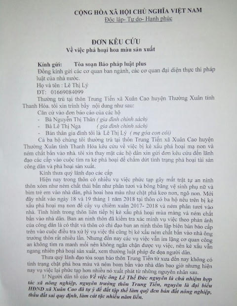Theo đơn thư kêu cứu gửi các cơ quan chức năng và PhapluatPlus.vn, bà Lý tường trình, 3 gia đình trên đã bị kẻ xấu phun thuốc diệt cỏ, phá hoại mạ non, gây hoang mang dư luận địa phương.