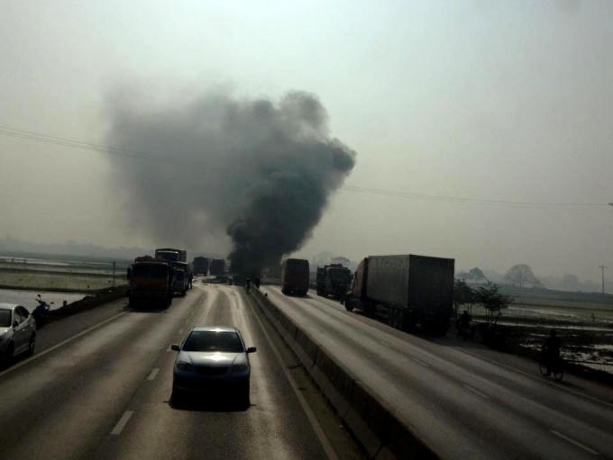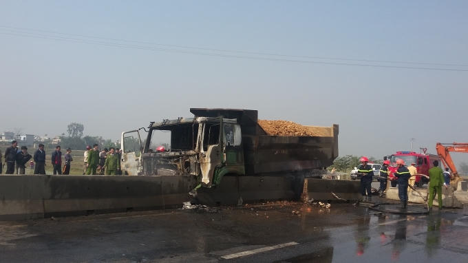 Cú đâm quá mạnh làm xe tải bị nổ lốp, gầm xe đổ sập, phần cabin bốc cháy ngùn ngụt. Ít phút sau chỉ còn trơ trọi lại khung cabin. Nam tài xế khoảng 30 tuổi may mắn thoát chết do kịp phá cửa chạy ra ngoài trước khi xe cháy.